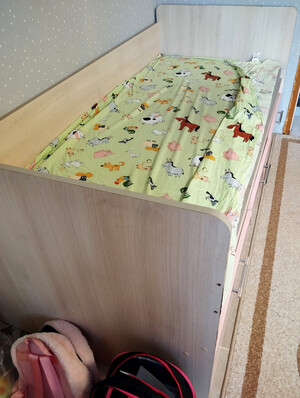 Продам кровать с объемным бортиком дельфин, мдф\лдсп, ручки не расшатаны, все шкафчики добротно сидят, кровать так же не расшатана. Треснула плёнка на среднем шкафчике, ещё в первый год использования. Кровать рассчитана до взрослого возраста. Не собирались продавать, но нужна двухъярусная.