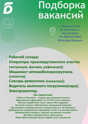 Приглашаем на постоянную работу в ООО " Усманское КХП" (старый элеватор) рабочих (транспортерщик). Оформление ТК РФ, доставка служебным транспортом, столовая (бесплатно), стабильная, достойная з/п 2 раза в месяц (зарплата, аванс), полностью оплачиваемые переработки.