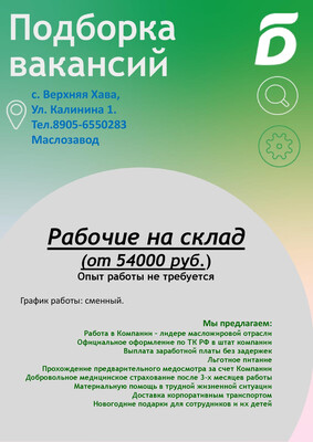 Цена от 54000р | На постоянную работу на Маслозавод Верхняя Хава требуются рабочие без предъявлений к опыту работы. Трудоустройство по ТК РФ, Стабильная выплата з/п два раза в месяц. Доставка корпоративным транспортом, льготное питание, обеспечение специальной одеждой, на предприятии оборудованы комнаты отдыха и приема пищи. По вопросам трудоустройства обращаться по телефону: +79056550283 (WhatsApp).
