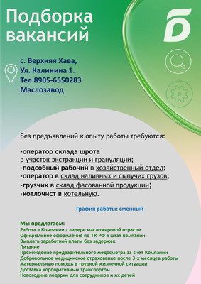 Цена от 40000р | На постоянную работу на Маслозавод Верхняя Хава требуются рабочие без предъявлений к опыту работы. Трудоустройство по ТК РФ, Стабильная выплата з/п два раза в месяц. Доставка корпоративным транспортом, льготное питание, обеспечение специальной одеждой, на предприятии оборудованы комнаты отдыха и приема пищи. По вопросам трудоустройства обращаться по телефону: +79056550283 (WhatsApp).